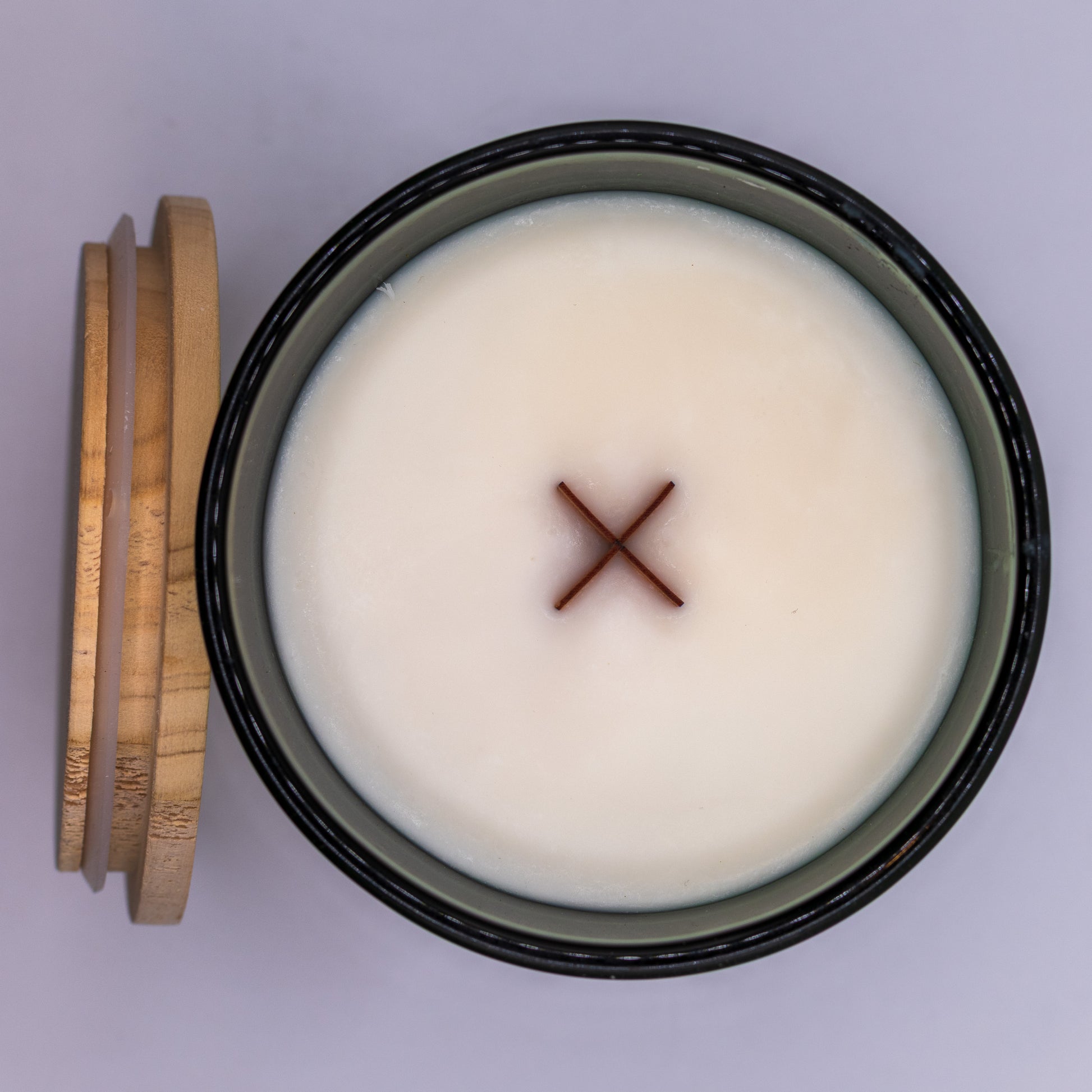 Vela de cera de soja vertida a mano con una mecha de madera natural que cruje suavemente cuando se enciende, creando un ambiente acogedor.